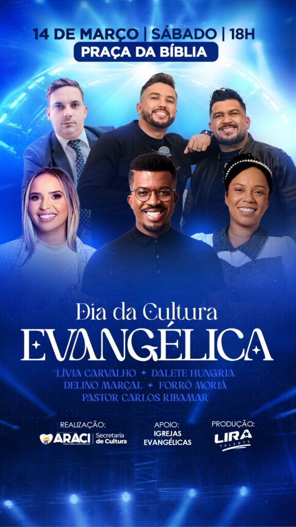 A cidade de Araci vai sediar, no próximo dia 14 de março, a partir das 18h, uma grande celebração do Dia da Cultura Evangélica, com evento aberto ao público na Praça da Bíblia. A programação contará com momentos de louvor, adoração e ministrações voltadas à comunidade cristã, reunindo nomes conhecidos da música gospel e líderes religiosos. Entre as atrações confirmadas estão os cantores Delino Marçal, Lívia Carvalho e Dalete Hungria. O evento também terá apresentação do grupo Forró Moriá e participação do Pastor Carlos Ribamar, que levará uma mensagem ao público presente. A realização é da Prefeitura Municipal de Araci, por meio da Secretaria de Cultura de Araci, com apoio das igrejas evangélicas do município. A produção do evento fica por conta da Lira Talents. A expectativa é reunir fiéis de diferentes denominações em uma noite marcada por música, fé e comunhão. O evento faz parte do calendário cultural do município e busca valorizar a expressão da cultura evangélica na cidade. Segundo a organização, toda a população está convidada a participar da programação, que promete um momento especial de celebração e espiritualidade no coração da cidade.